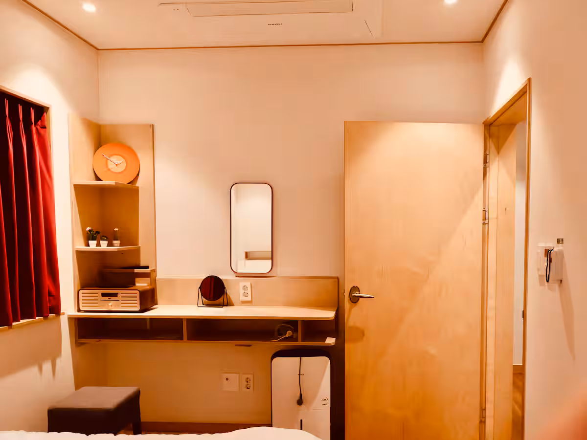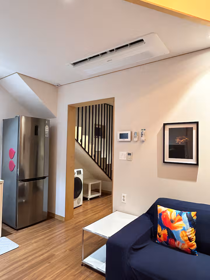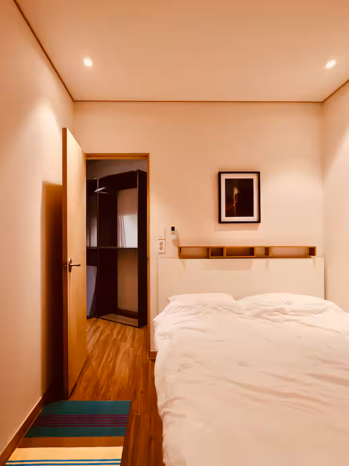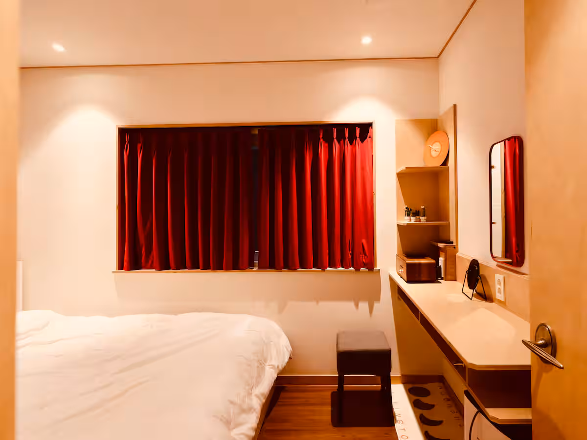 퀸사이즈 침대 · 에어컨 · 옷걸이 · 의류 보관 공간 · 침구